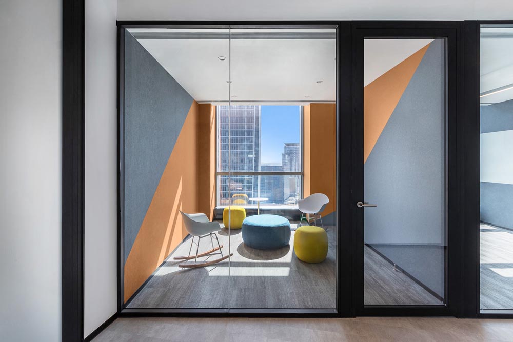 这里是洽谈室,主要用于临时会议与浅谈方案,拼色元素的加入使空间的气氛活跃而轻松起来。
