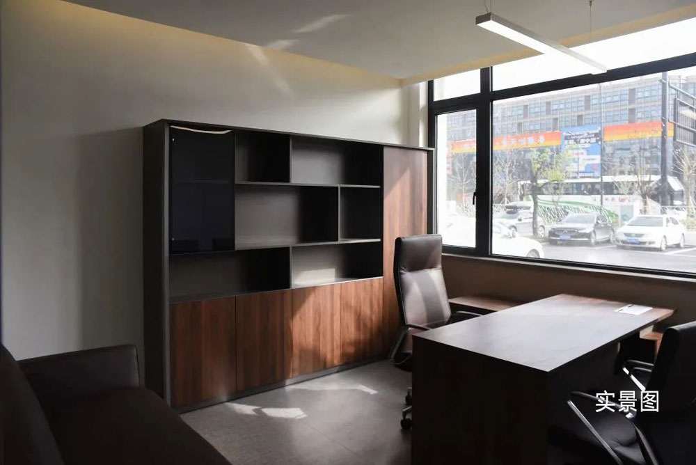 设计师利用玻璃门搭配木质办公家具,将古典与现代相融合,营造出低调的奢华感。几乎布满整面墙的玻璃窗设计满足了办公室充足的光线和视线范围。