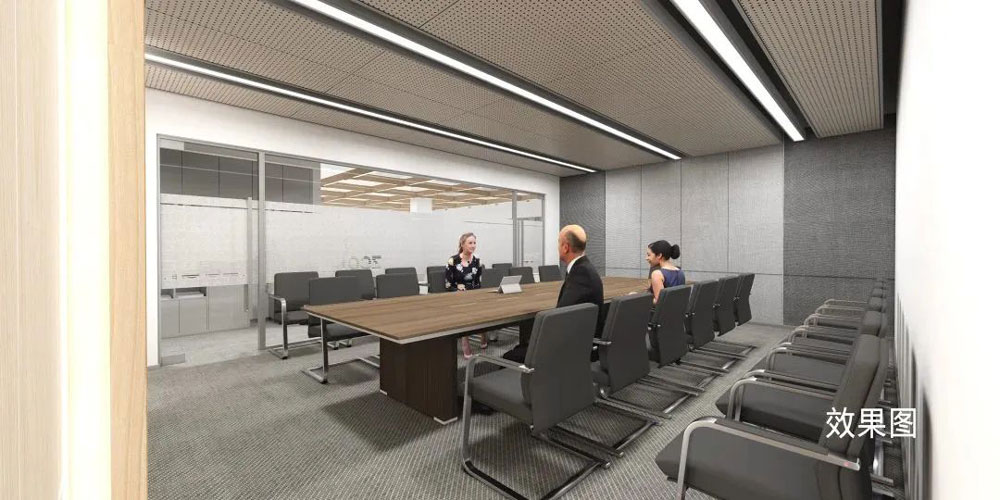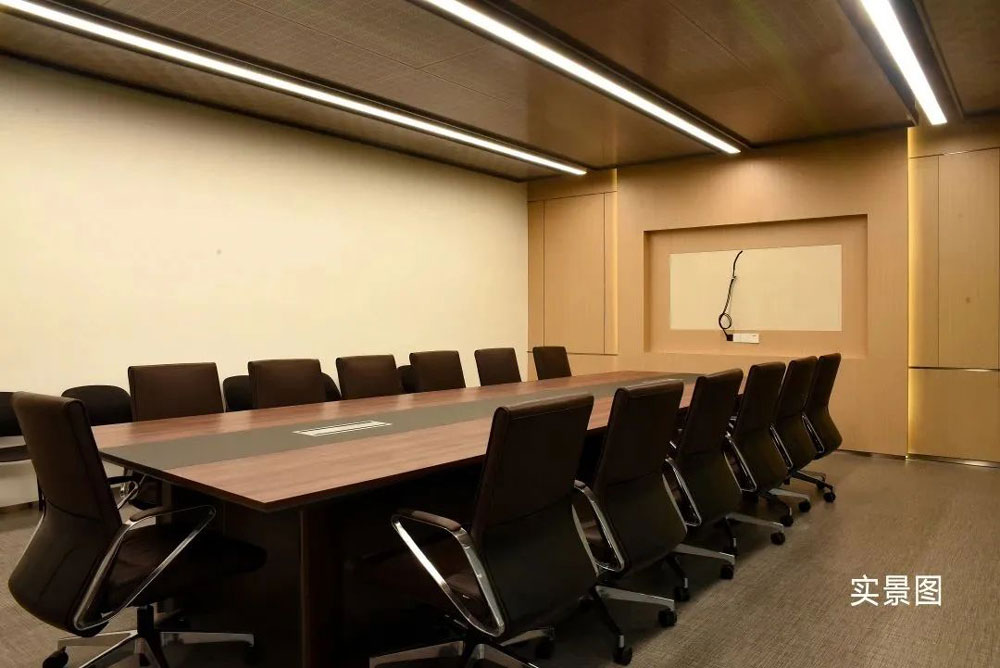整个会议室看起来宽敞大气又通透,设计师利用线条灯带设计,木色、黑色办公桌椅点缀提亮空间。