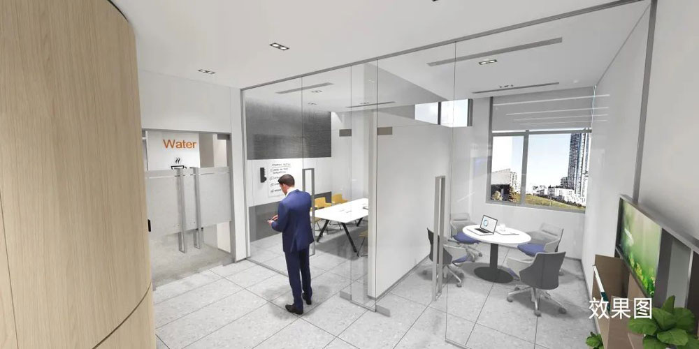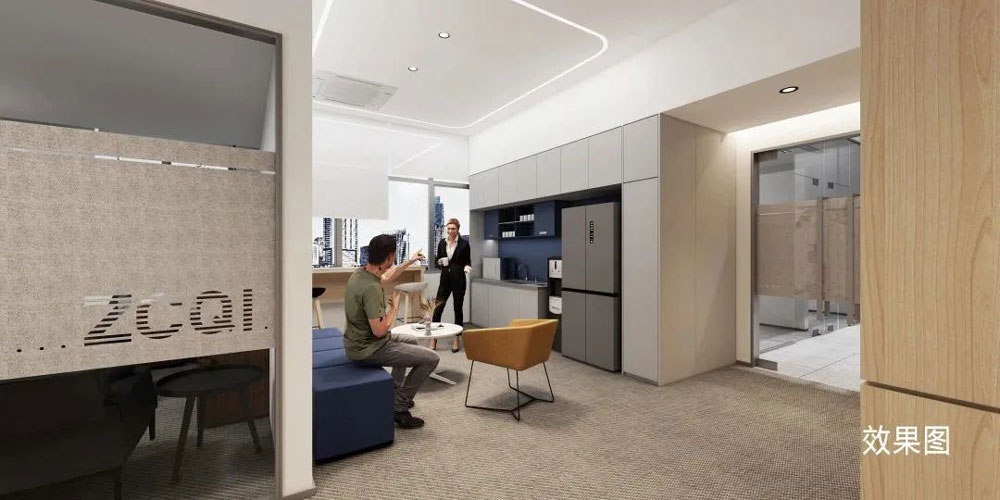 开放型休闲区/洽谈区既满足日常接待,也为员工提供工作之余的休憩。空间造型设计利用色彩区块设计呈现出深入浅出的空间质感。同时,独特的构造为空间提供多的观察体验和细节感受。