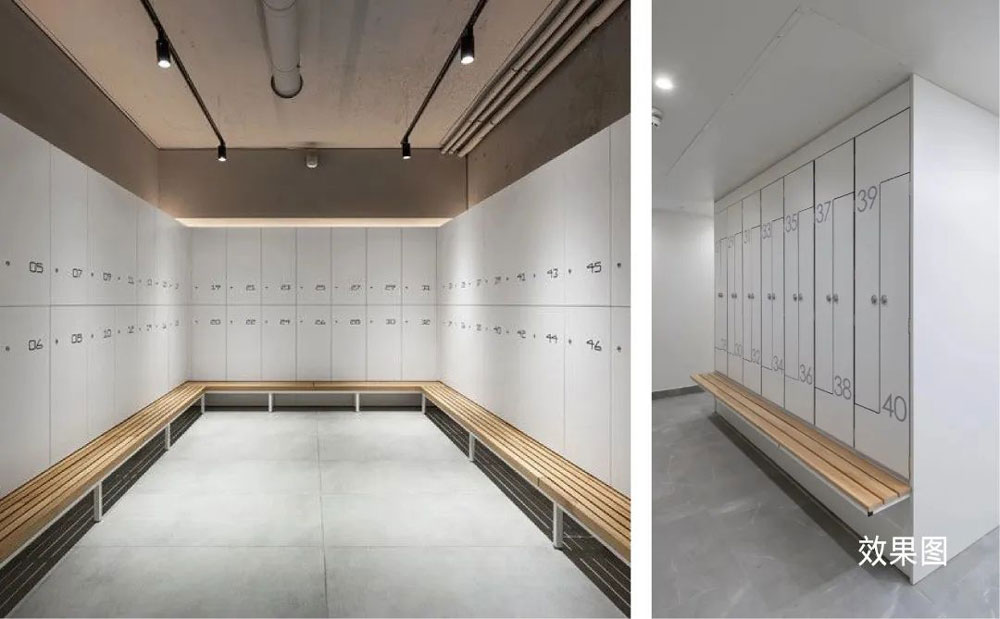 白色和木元素在不同的空间呈现出不同的形态特征。更衣间主体为白色调,木元素做辅助。
