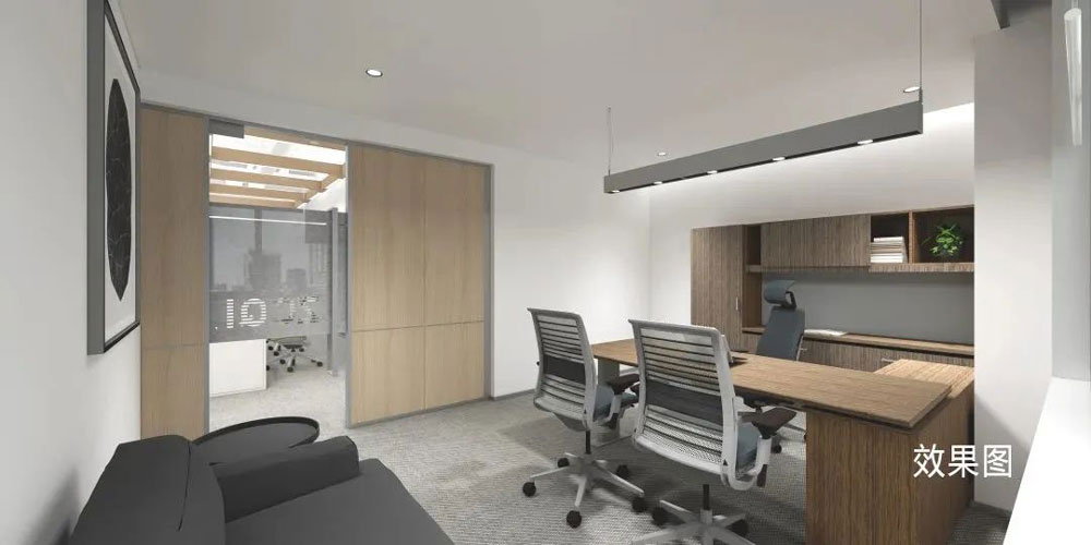 设计师利用玻璃门搭配木质办公家具,将古典与现代相融合,营造出低调的奢华感。几乎布满整面墙的玻璃窗设计满足了办公室充足的光线和视线范围。