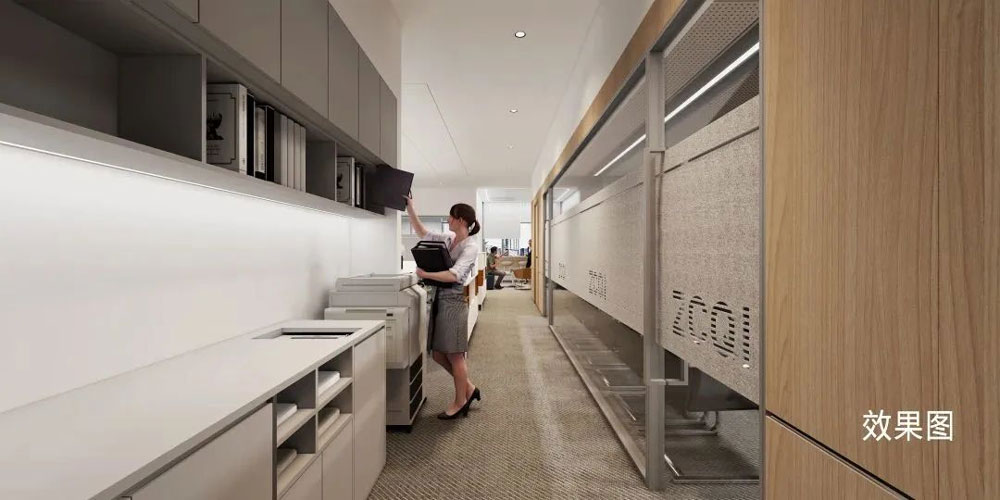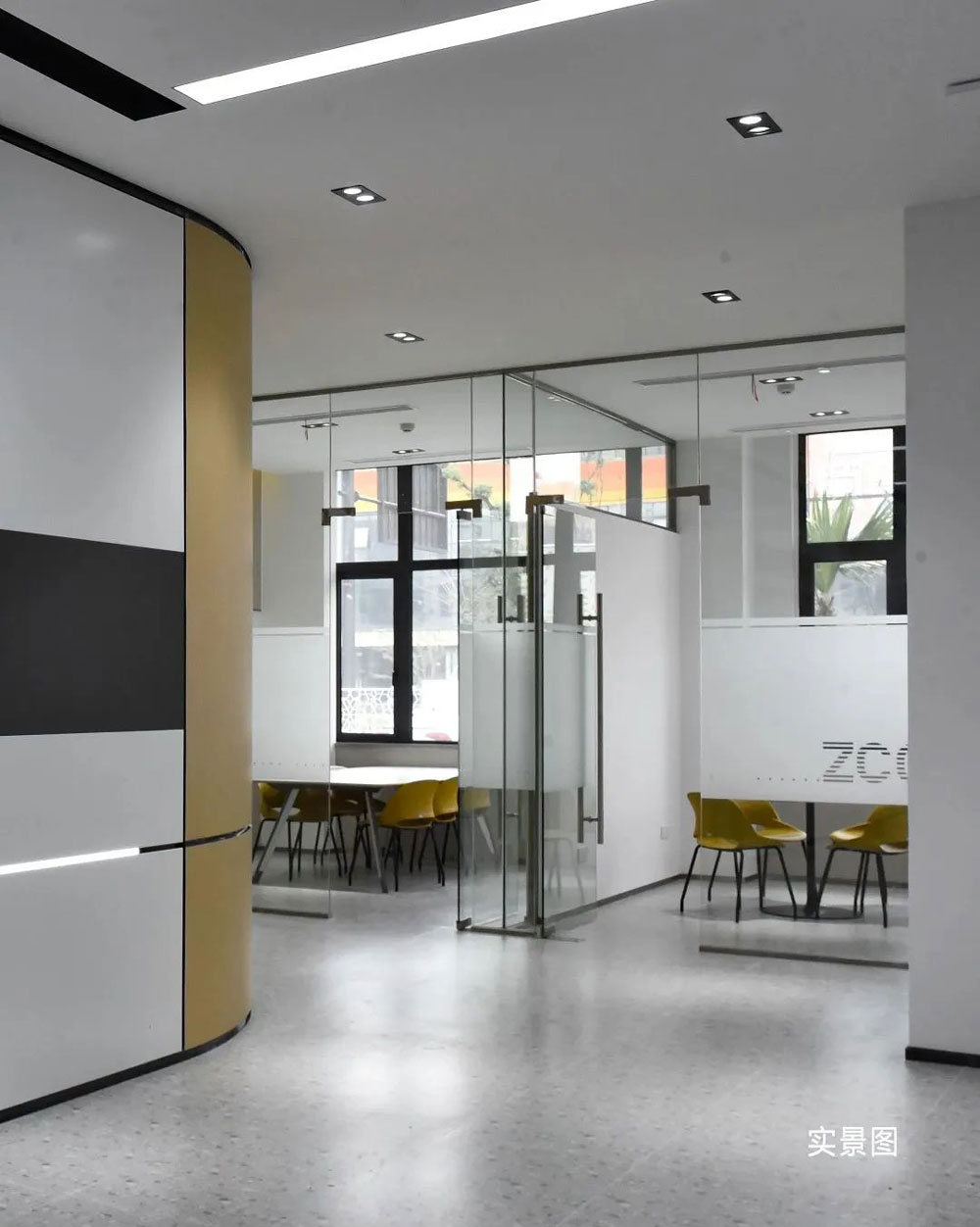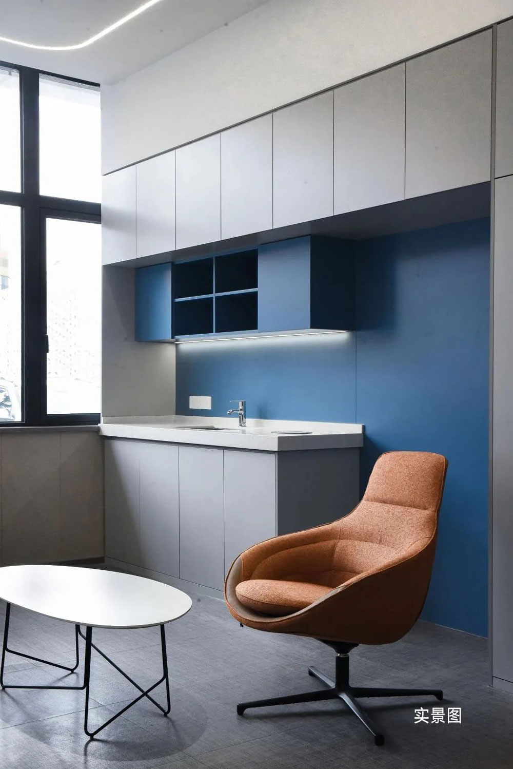 开放型休闲区/洽谈区既满足日常接待,也为员工提供工作之余的休憩。空间造型设计利用色彩区块设计呈现出深入浅出的空间质感。同时,独特的构造为空间提供多的观察体验和细节感受。